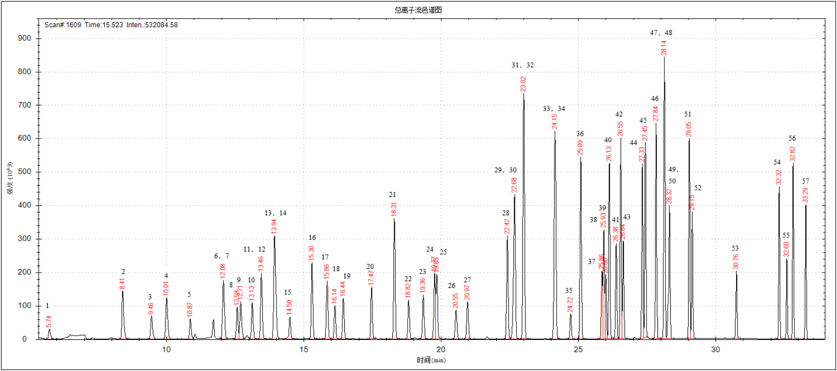 ▲ 图1 55种挥发性有机物总离子流图(100ppm)