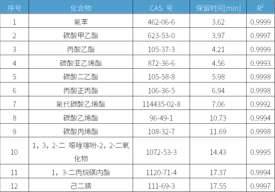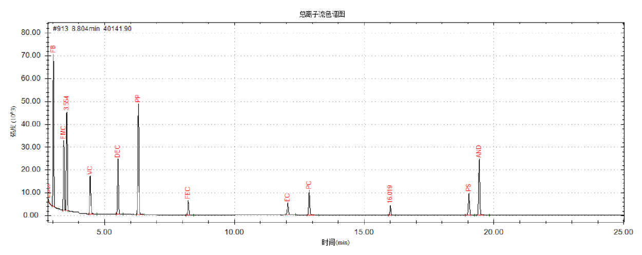 使用赛里安8300GC-8700SQ气质联用仪对锂电池电解液中12种有机化合物进行检测,该方法满足于锂电池电解液组分分析要求,具有灵敏度高,重复性好,线性好,检测结果准确可靠操作方便等优点,是分析锂电池电解液组分的理想方案。