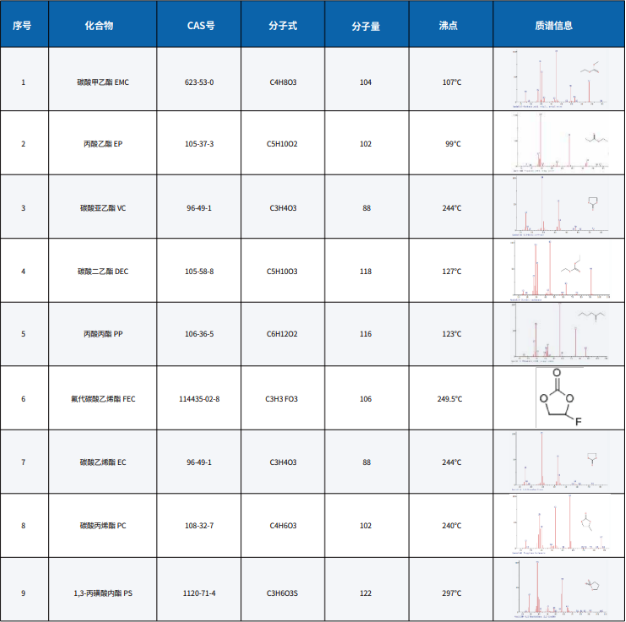 电解液常用有机溶液成分的质谱检测信息如下表