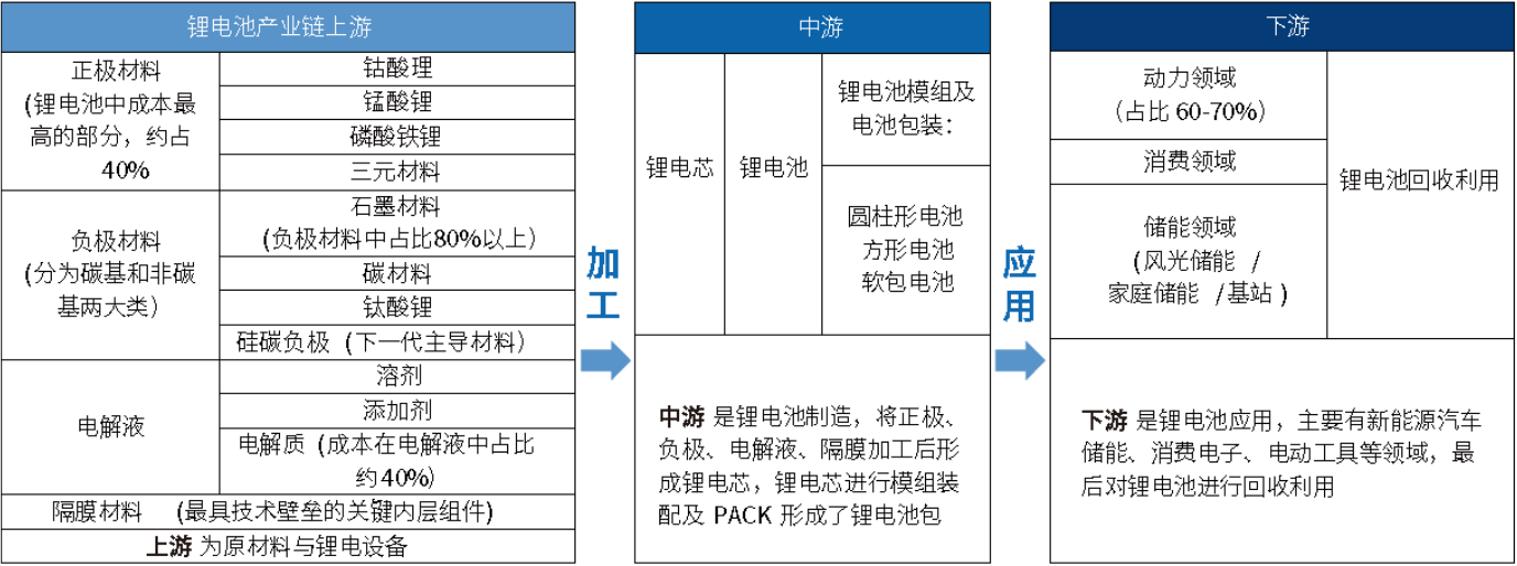 表1 锂电产业链上/中/下游涉及的不同原材料及加工和应用