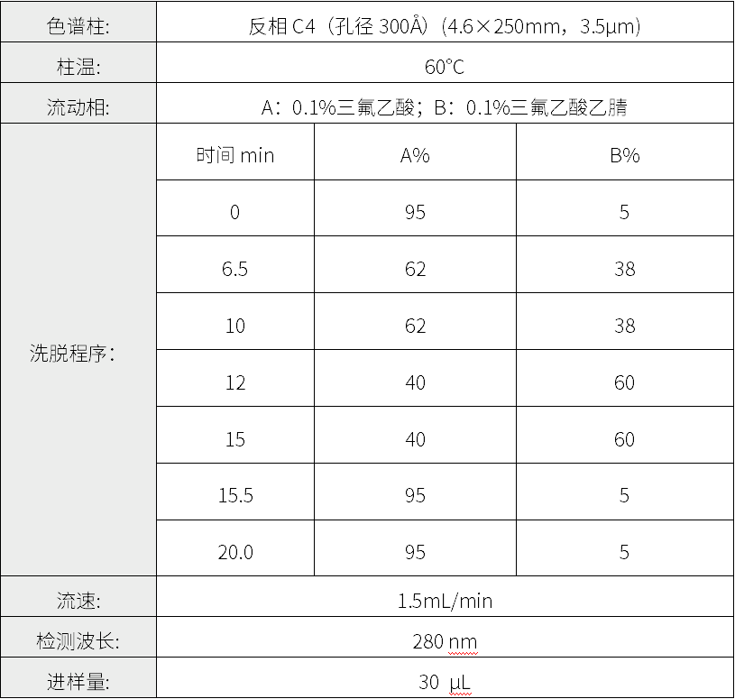 ● 首次使用ChromCore 300 C4-T色谱柱时,可能会出现色谱峰型不对称或响应低的情况,此时需要使用高浓度牛乳铁蛋白对照品(400 μg/mL进样100 μL)对色谱柱进行钝化处理,钝化后将色谱柱冲洗至无牛乳铁蛋白的目标峰后,再进行样品分析;