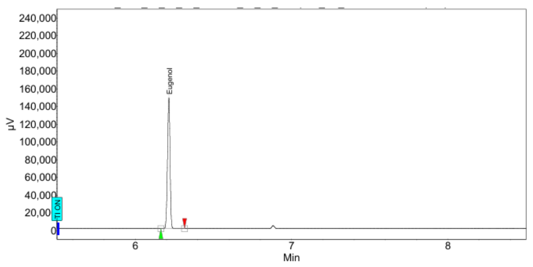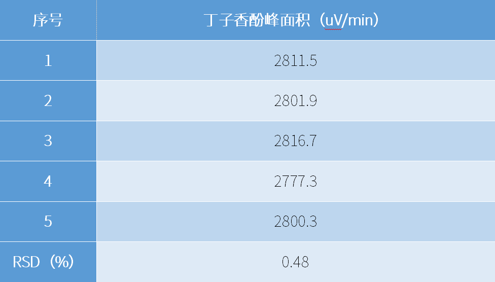 结果● 样品体系:丁子香酚技术级原料(TGAI),配制两组方法精密度样本(n=5,0.5 mg/mL);